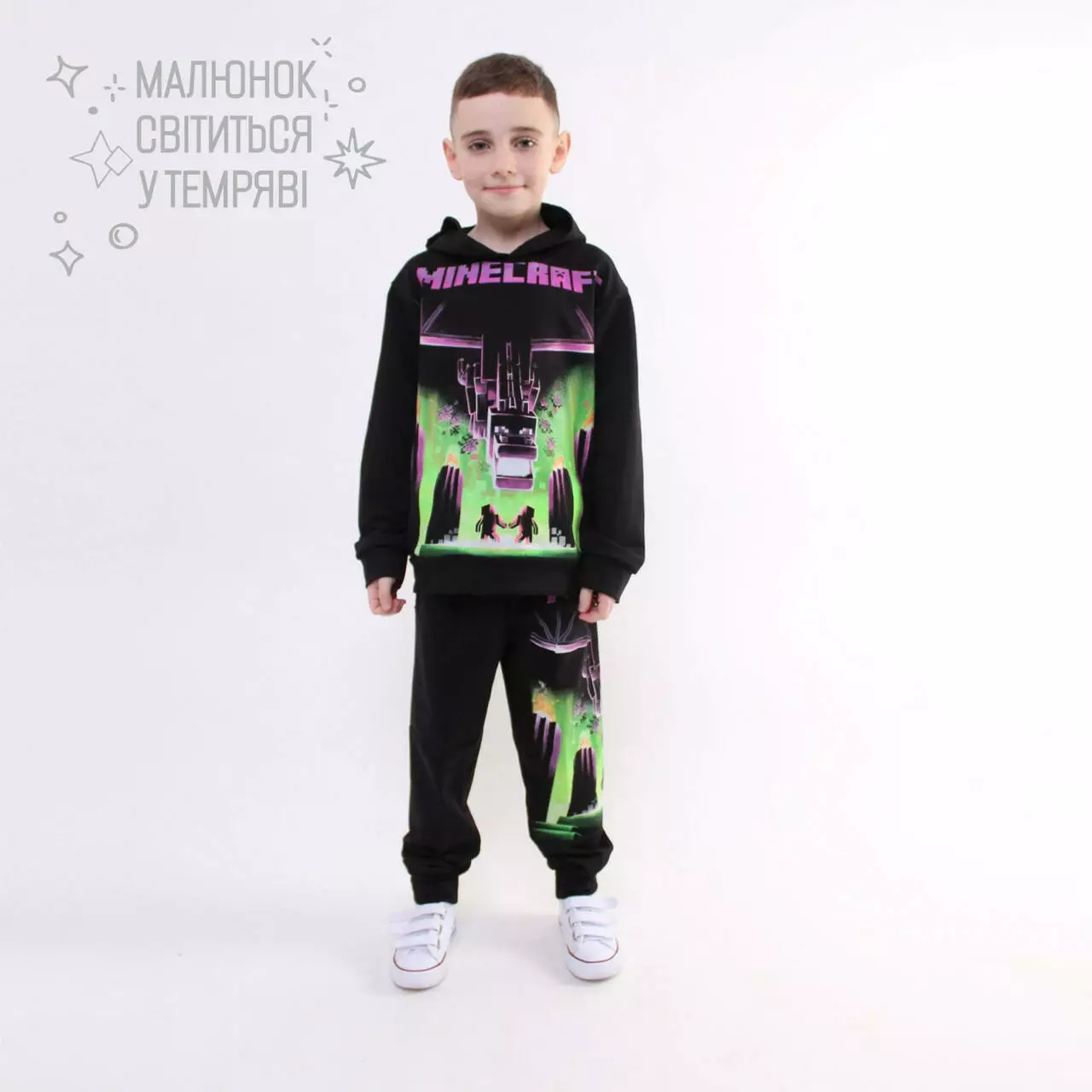 Штани, що світяться, та кофта з принтом "Minecraft" для дітей. Малюнок накопичує світло, після чого світиться в темряві. Дуже ефектний вигляд має. Такий одяг викличе захоплення в будь-якої дитини, а підлітку дасть змогу проявити свою індивідуальність.