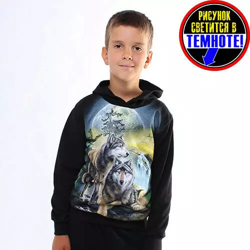Худі, що світяться, з принтом.Малюнок накопичує світло, після чого світиться в темряві. Дуже ефектний вигляд має. Такий одяг викличе захоплення в будь-якої дитини, а підлітку дасть змогу проявити свою індивідуальність.